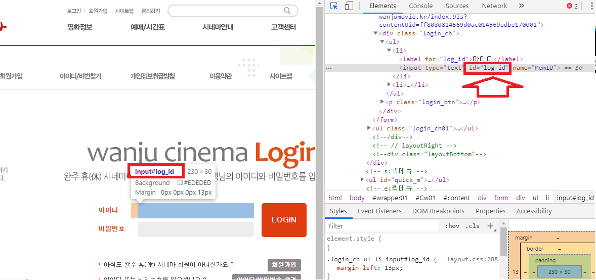 이 부분은 브라우저로 들어가서 f12를 누르면 사진의 오른쪽처럼 html을 볼 수 있는데 이곳에서 요소의 id값을 확인 가능합니다.