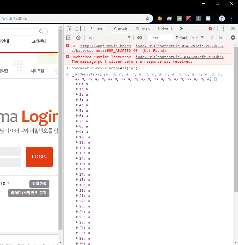 크롬에서 f12를 눌러 console창에 document.querySelectorAll("a")를 입력합니다.