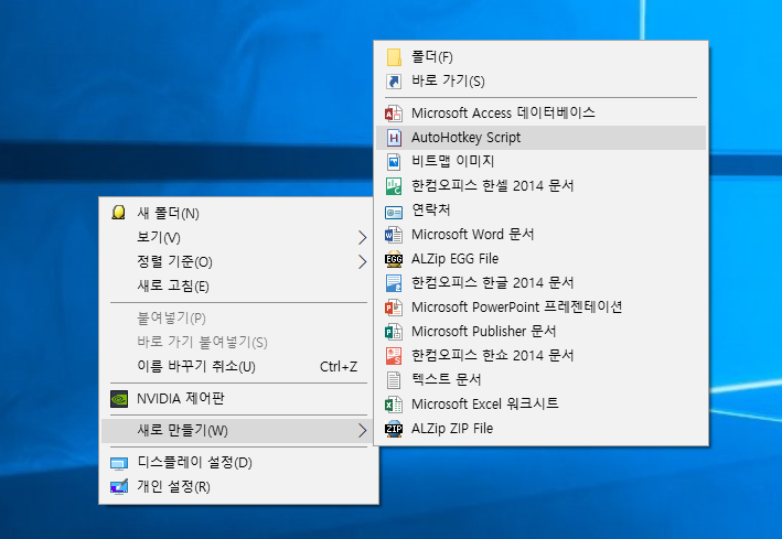 바탕화면에 우클릭-> 새로 만들기-> AutoHotkey Script를 눌러주시면 끝입니다.