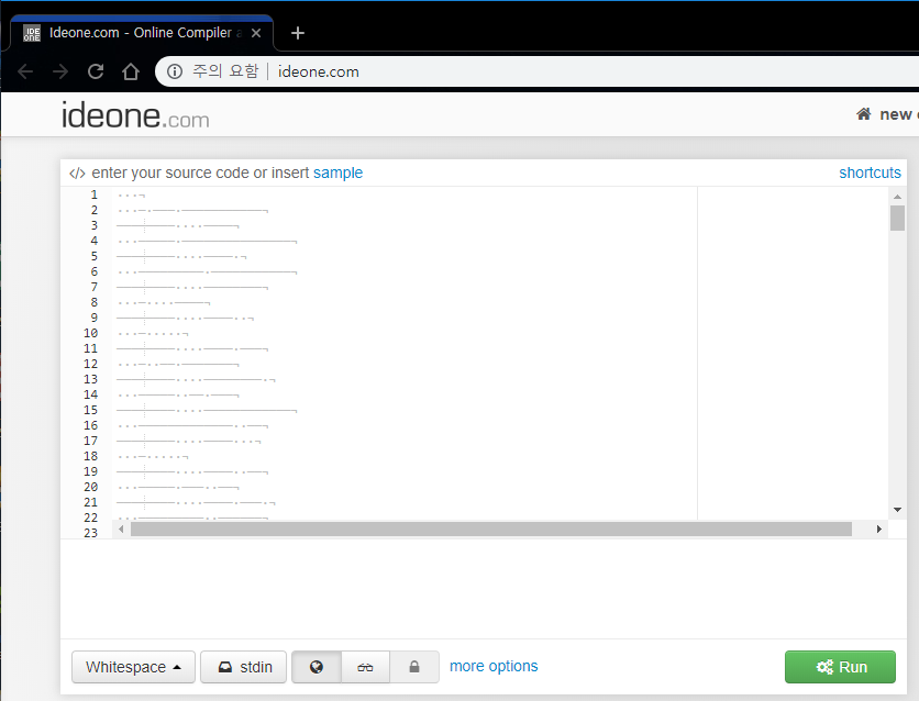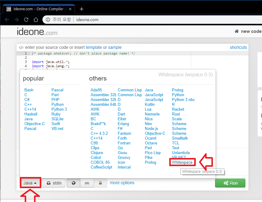 먼저 위의 컴파일 사이트에 들어가서 언어를 whitespace로 설정해주겠습니다.