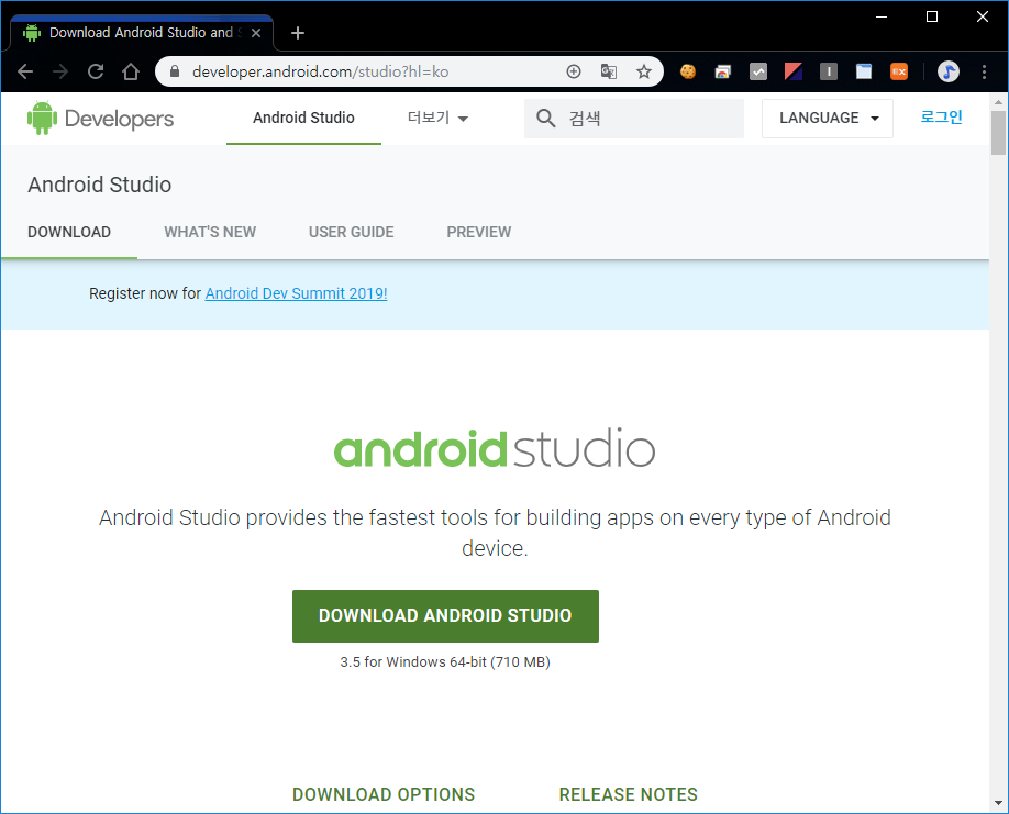 안드로이드 스튜디오를 설치하기 위해서 아래 사이트로 들어가 주세요.