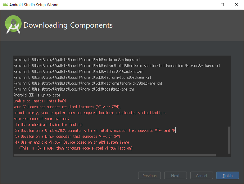 저번에 안드로이드 스튜디오 설치했을 때 컴퓨터의 계정 이름이 한글로 되어있어서 고생했었습니다.