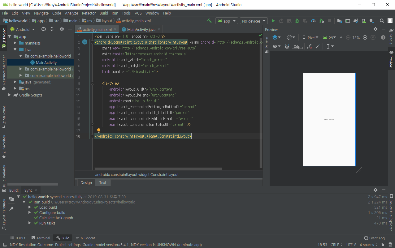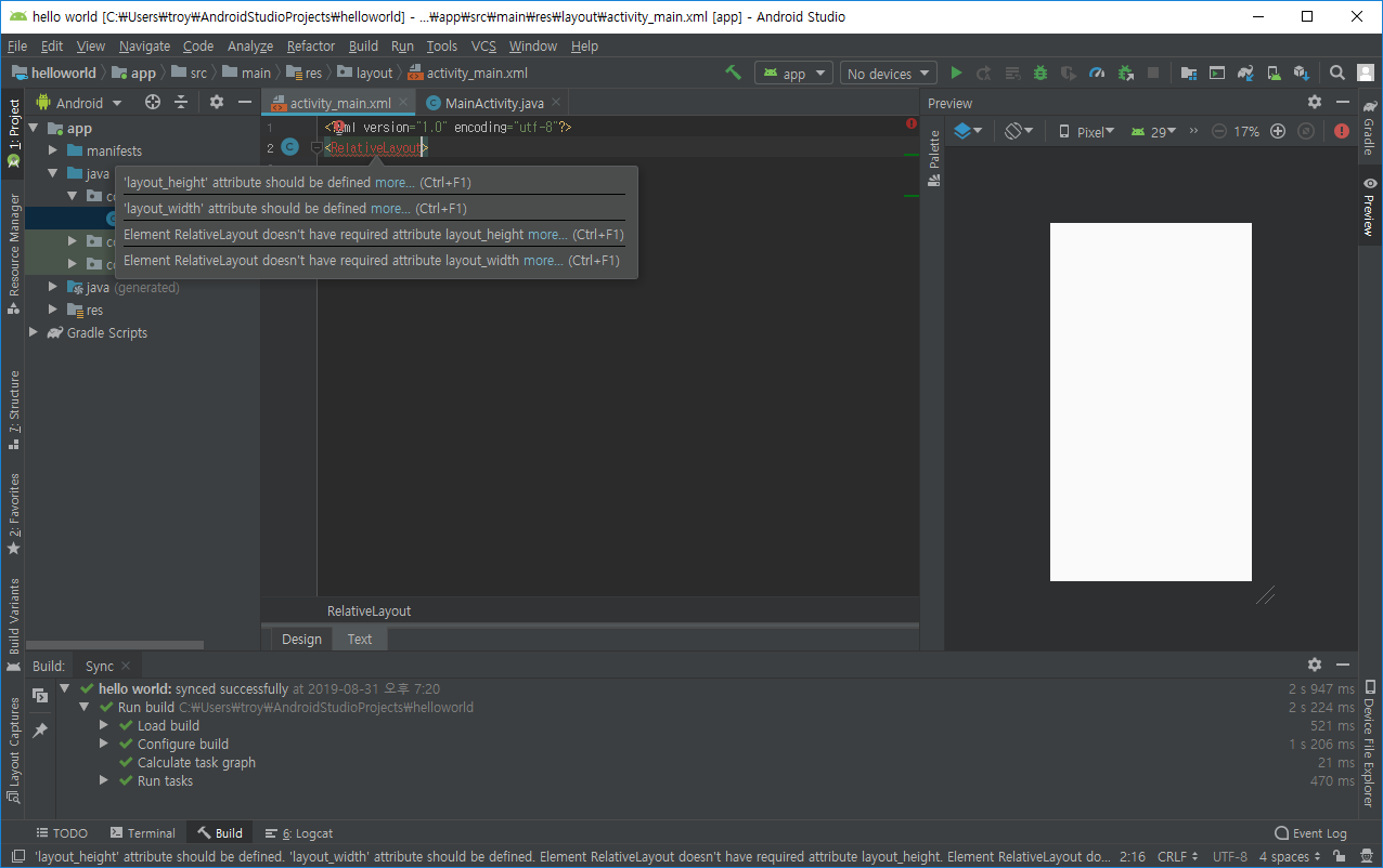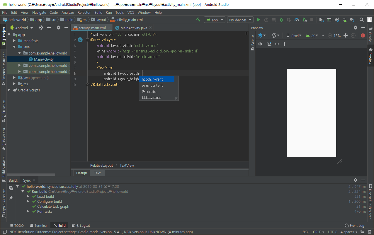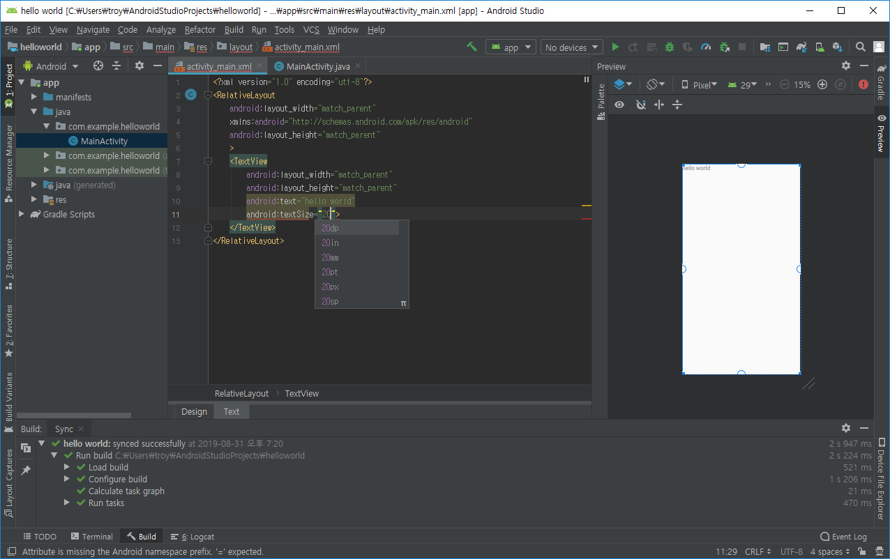 이제 텍스트를 추가하기 위해서 android:text="Hello World"를 추가합니다.