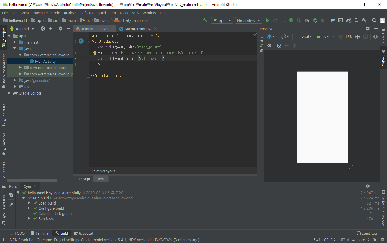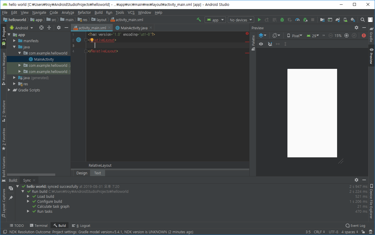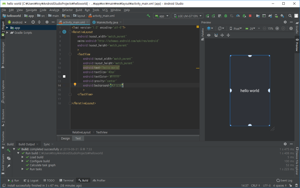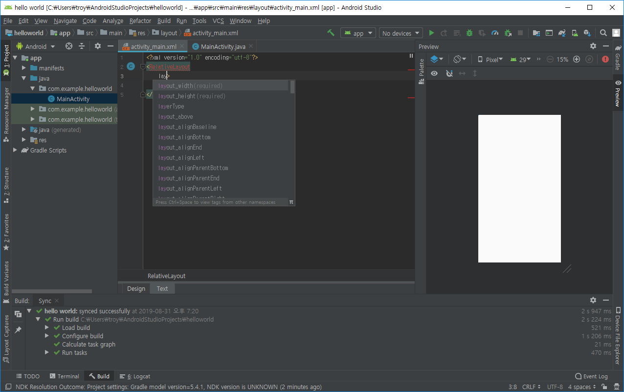 이제 텍스트를 추가하기 위해서 android:text="Hello World"를 추가합니다.