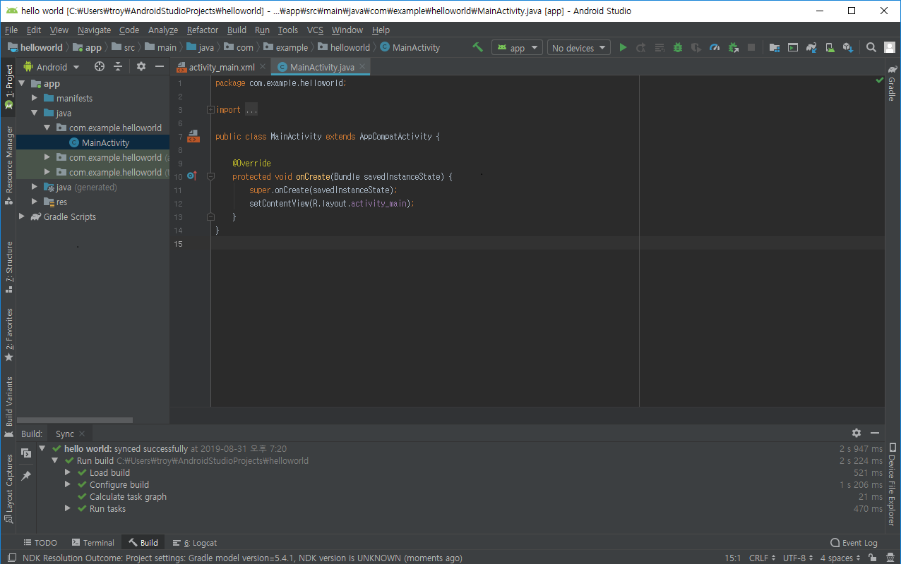 오늘은 안드로이드 스튜디오로 Hello world를 출력하는 앱을 한번 만들어보겠습니다.