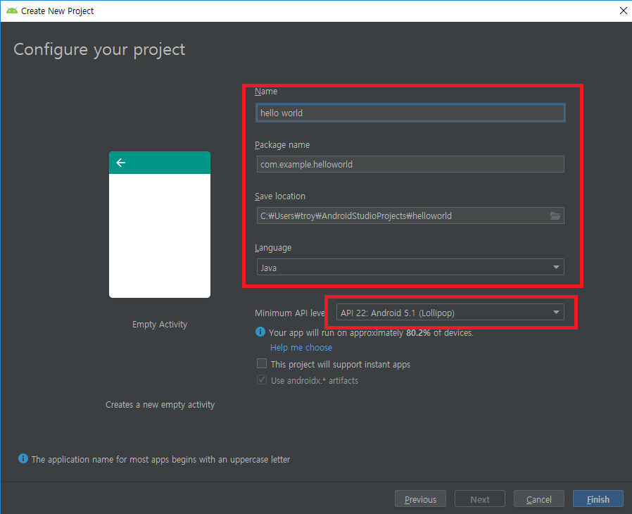 이제 이름(앱 이름), 저장 경로, 언어, API level 등을 선택해줍니다.