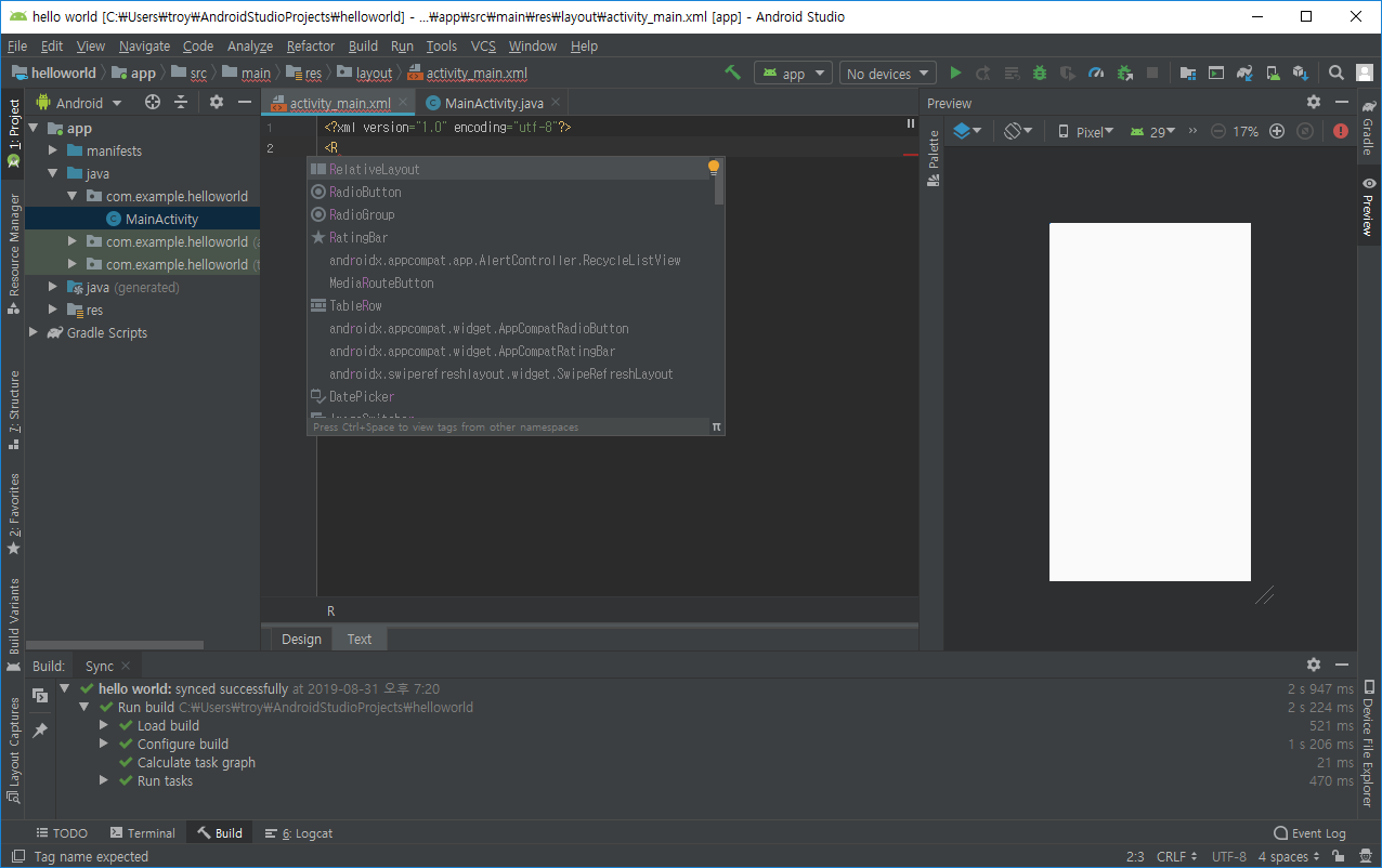이번엔 빈 activity에 hello world를 출력해보겠습니다.