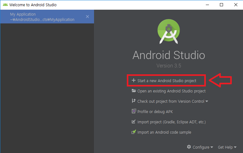 안드로이드 스튜디오의 메인 페이지에서 start a new Android studio project를 눌러줍니다.