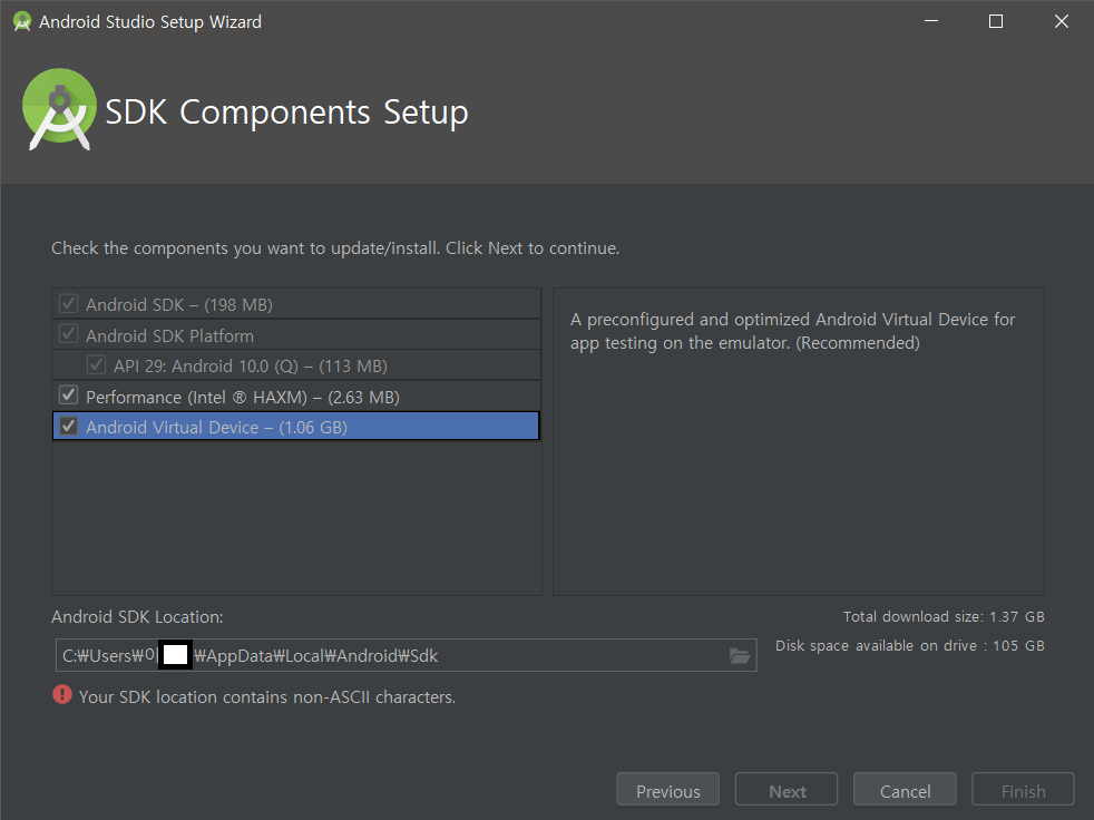 그런데 이 SDK를 설치할 때 설치 경로에 한글, 특수문자, 공백이 들어가면 오류가 생깁니다.