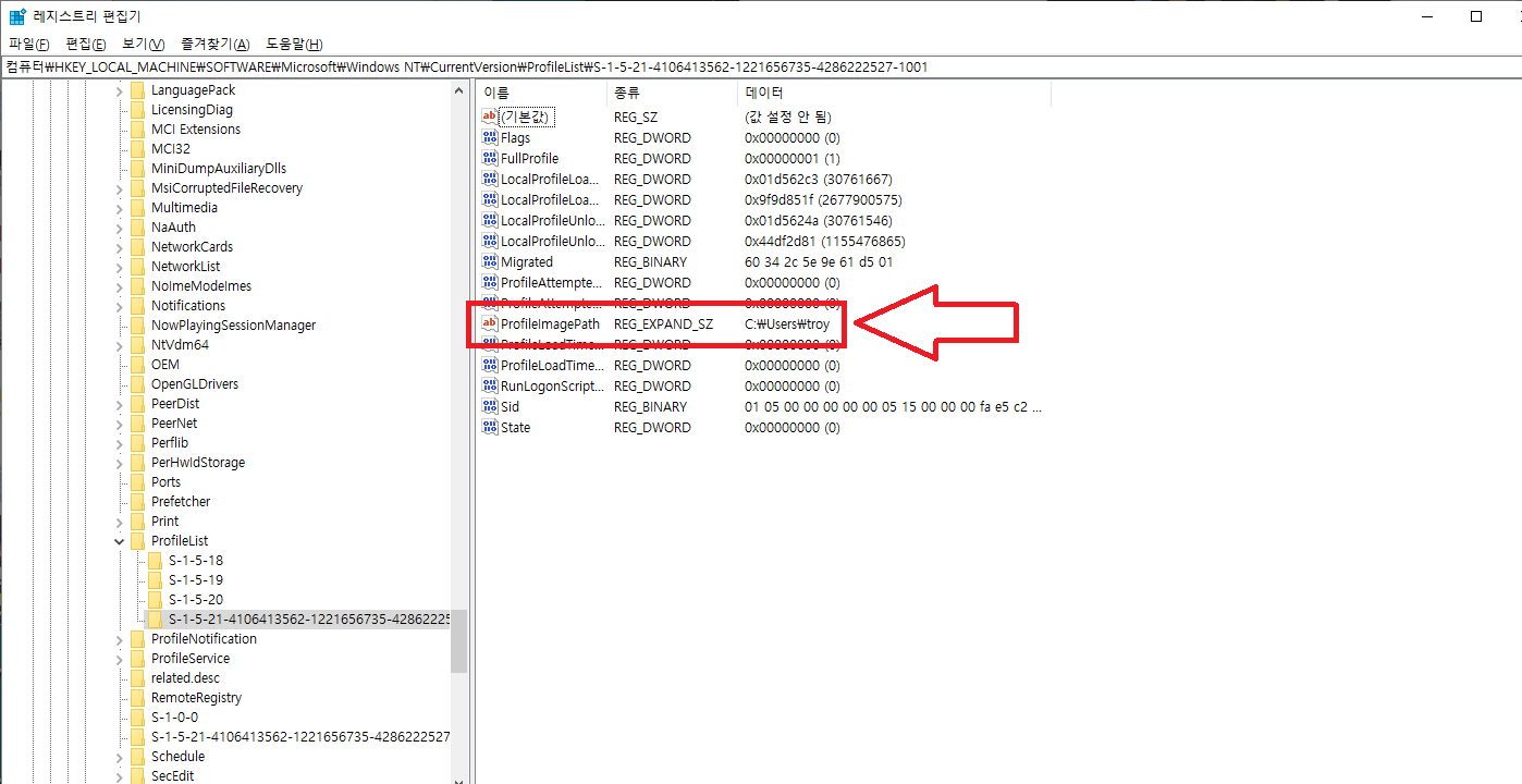 이 상태에서 다시 regedit을 입력해 레지스트리 편집기에 들어가 보면 PorfileList에 이름이 똑같은 .bak파일이 생겼을 겁니다.(임시 프로필이라 계정 폴더가 TEMP로 되어있네요.)