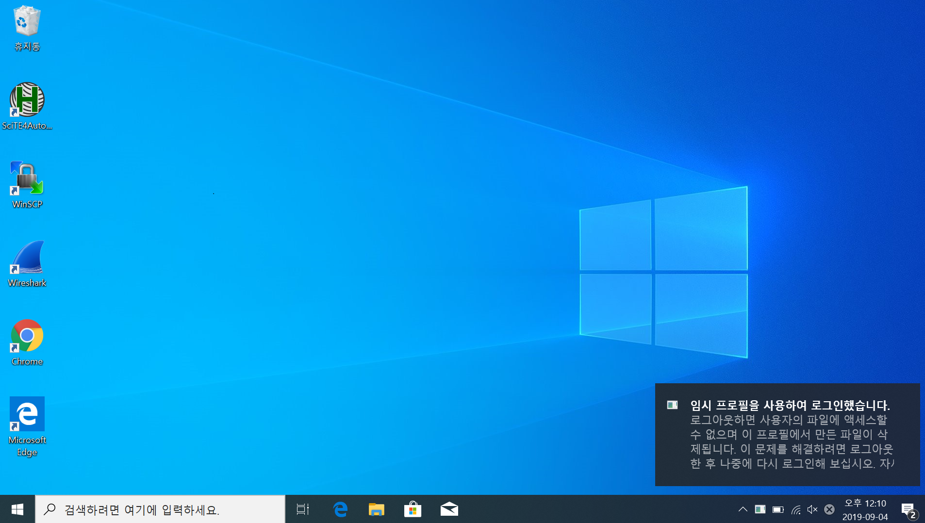 이렇게 하고 재부팅을 하면 레지스트리에 입력한 계정명과 같은 사용자 계정 폴더가 없기 때문에 임시 프로필을 사용하여 로그인했다고 나옵니다.