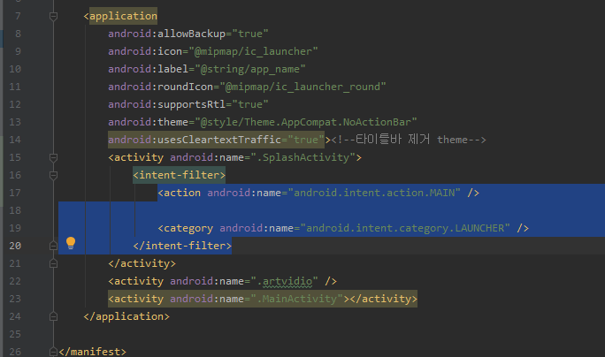 그 후 MainActivity보다 SplashActivity가 먼저 나와야해서 <intent-filter>부분의 위치를 MainActivity->SplashActivity로 이동해 줬습니다.(아래 사진 참고.)