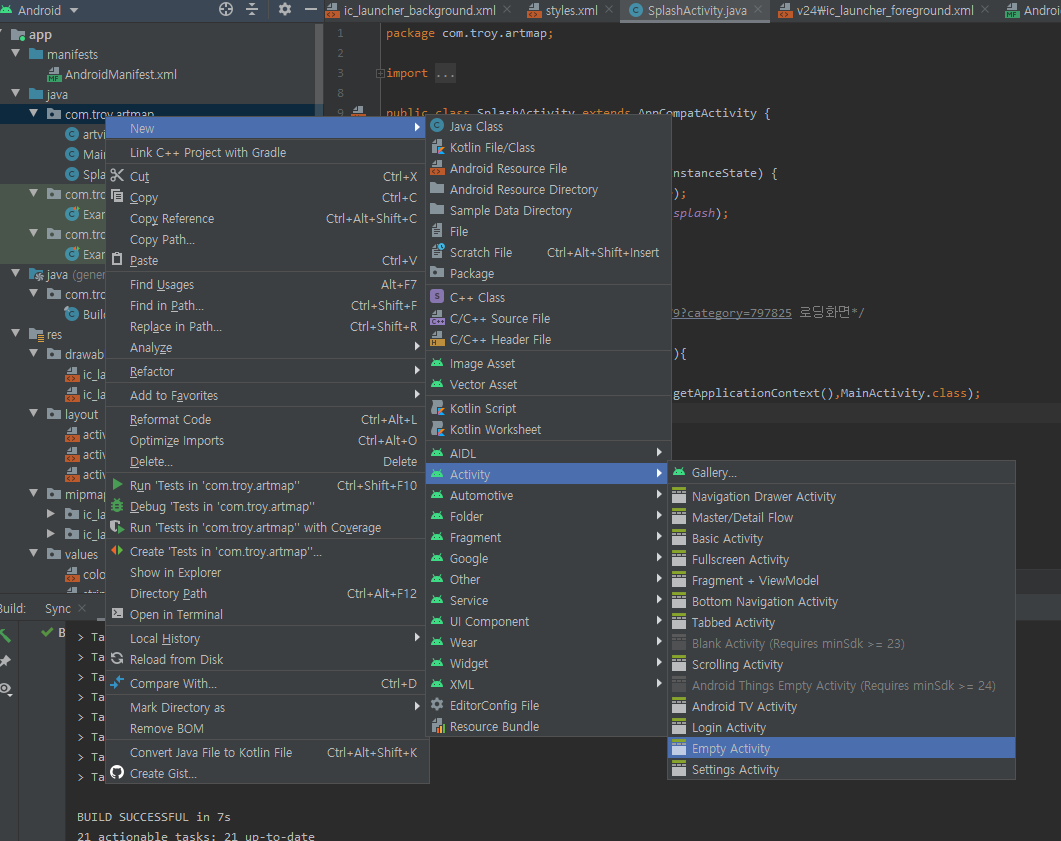 Empty Activity로 만들어서 SplashActivity.java파일과 activity_splash.xml파일이 생성되었습니다.