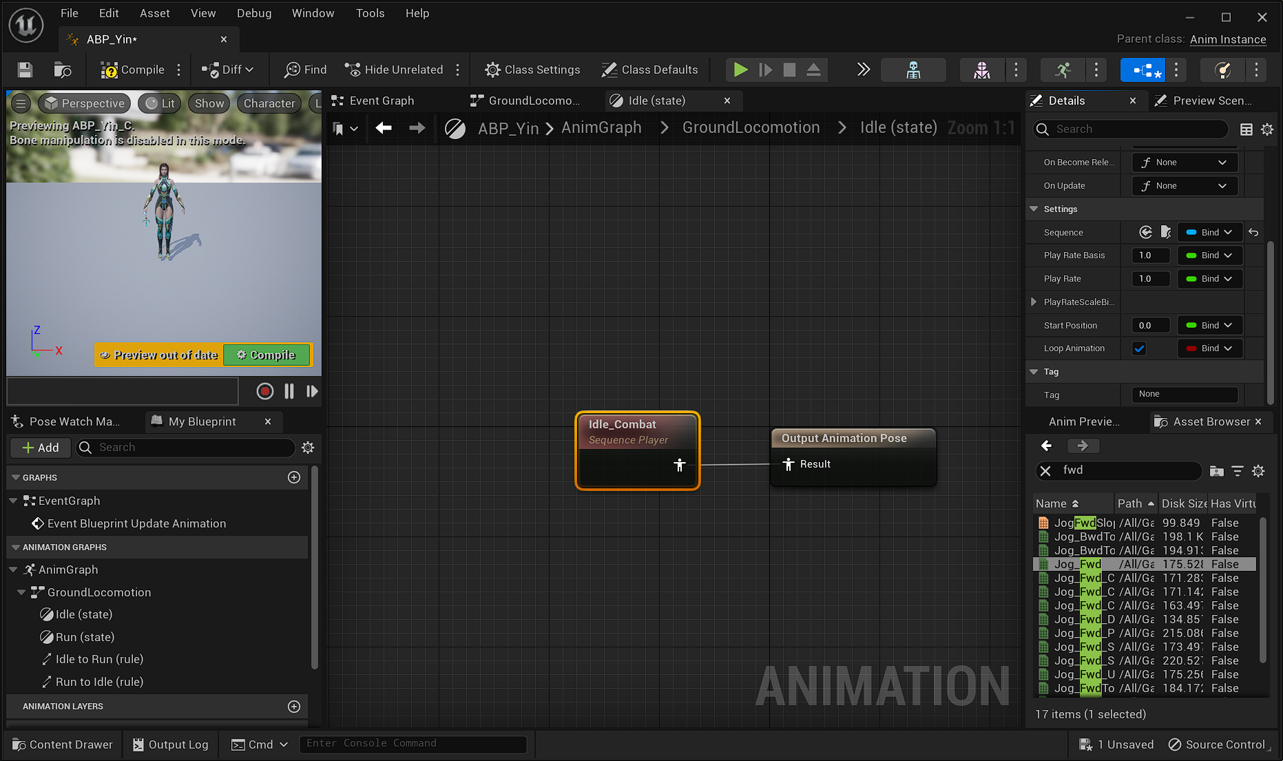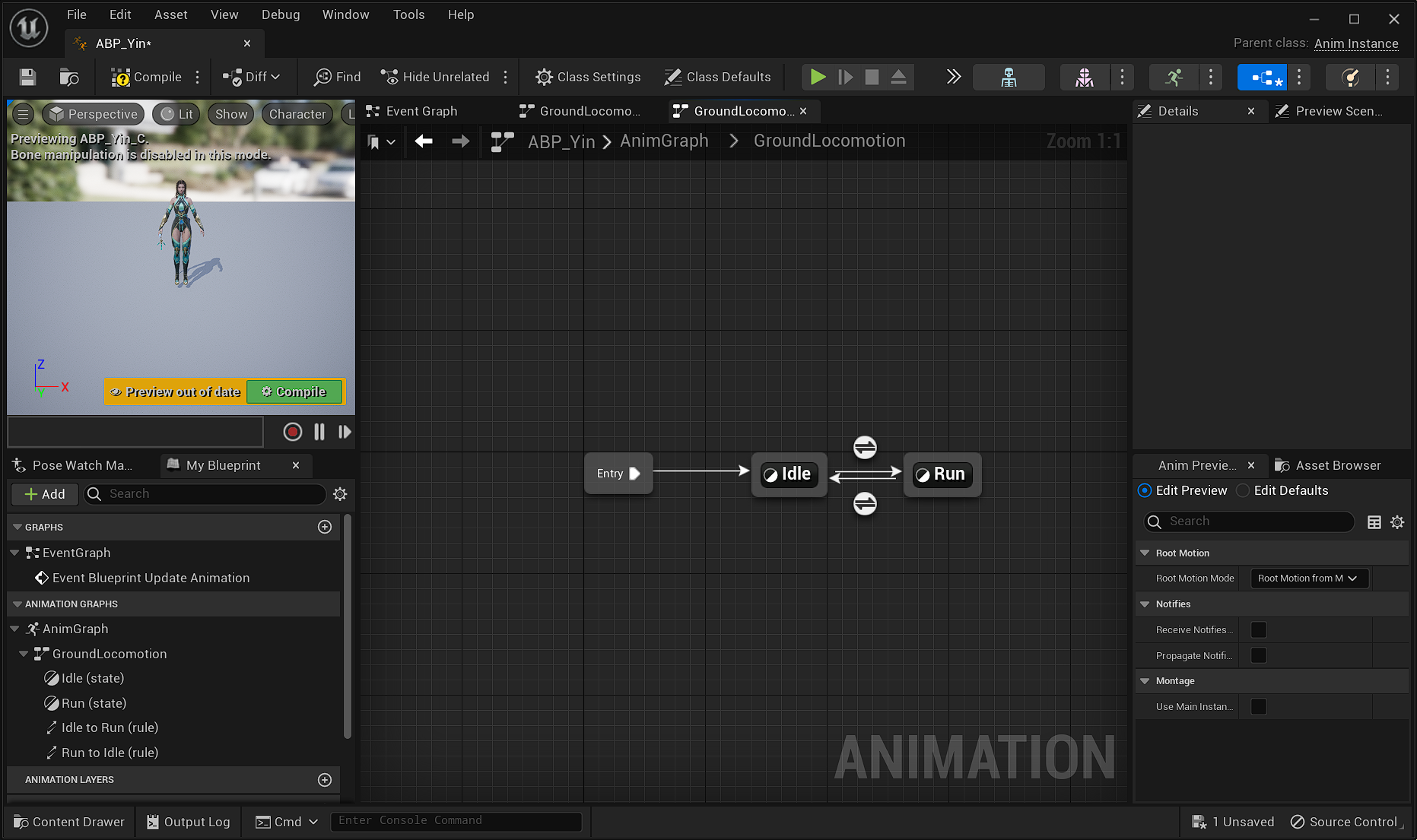 Animation Blueprint를 하나 생성해서 이름을 ABP_Yin으로 설정해 주었습니다.