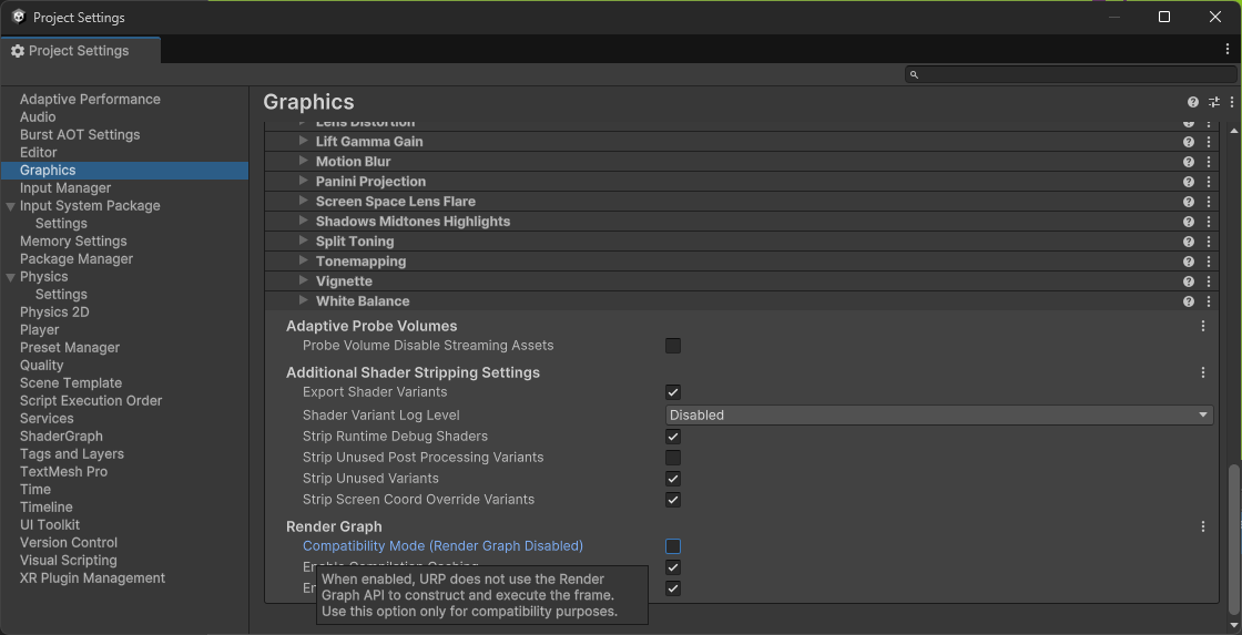 The project currently uses the compatibility mode where the Render Graph API is Disabled.