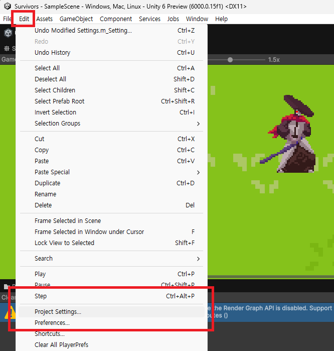 누가봐도 경고 메시지인 Compatibility Mode (Render Graph Disabled)를 찾습니다.