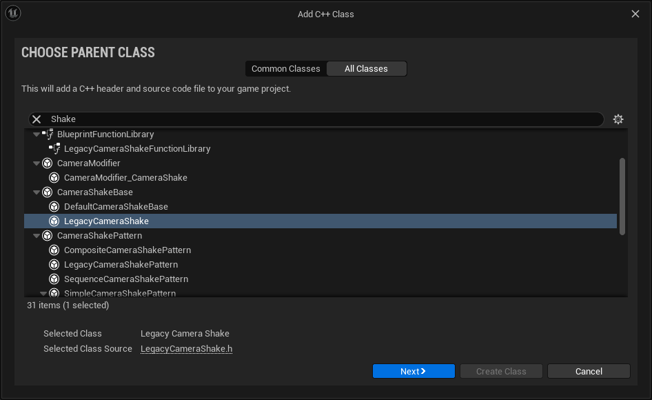"LegacyCameraShake" Class를 생성해줍니다.